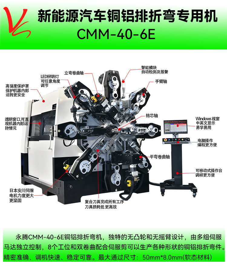 CMM-40-6E銅排折彎機(最大通過尺寸:50mm*8.0mm)集3D折彎機和彈簧機所有的功能于一體的多功能專用機,本機采用獨特的無凸輪和無搖臂設計,由多組伺服馬達獨立控制,永騰銅排折彎機廣泛應用于導電排成型,新能源電池連接排、新能源電池模組、銅母排成型、硬排成型、導電排、電池連接排、銅排、裸排成型等。精密準確、調機快速、穩(wěn)定可靠。