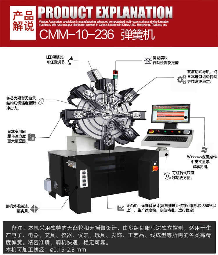 本機(jī)型適用于生產(chǎn)電子、電器、文具、儀器、玩具、發(fā)飾、工藝品、線成型等高難度精密彈簧。