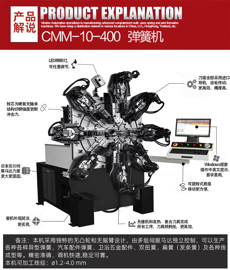 本機(jī)型適用于生產(chǎn)汽車(chē)、摩托車(chē)、自行車(chē)等車(chē)輛及娛樂(lè)健身器材所需的高精密彈簧的生產(chǎn)。