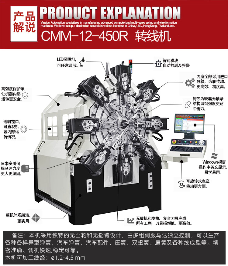 本機(jī)型適用于生產(chǎn)電子、電器、文具、儀器、玩具、發(fā)飾、工藝品、線成型等高難度精密彈簧。