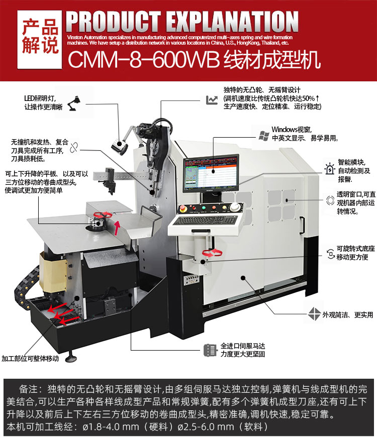 2、可加工6毫米鋼絲或8毫米軟線,目前成為國(guó)內(nèi)多家知名大型彈簧和線材成型企業(yè)必備的生產(chǎn)利器。